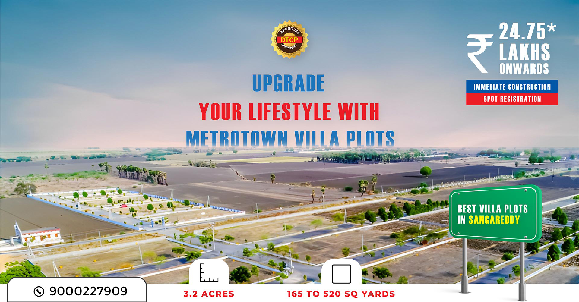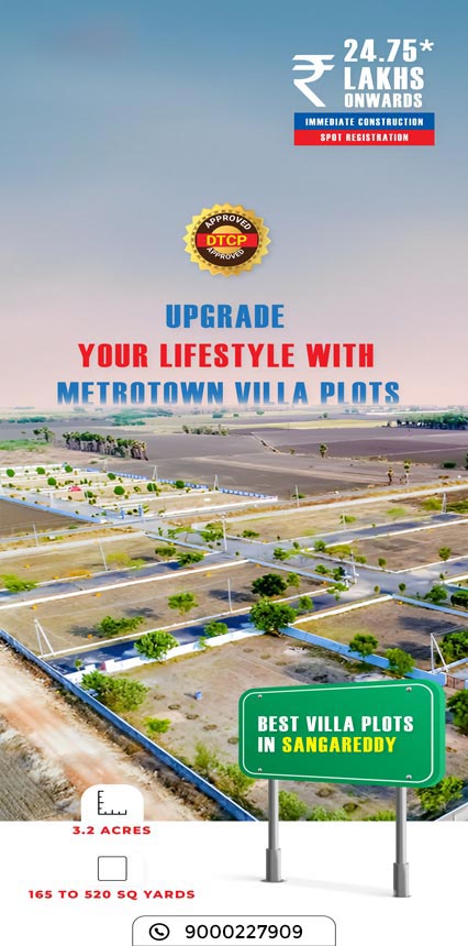 Cherish the luxuries of the world by building your own villa at Metrotown Villa Plots. Spreading over 3.2 acres, Metrotown offers a range of plot sizes varying from 165-520 sq yards vastu Compliant Plots. The perfect Project to relish the beauty of nature in the lap of pure luxury.